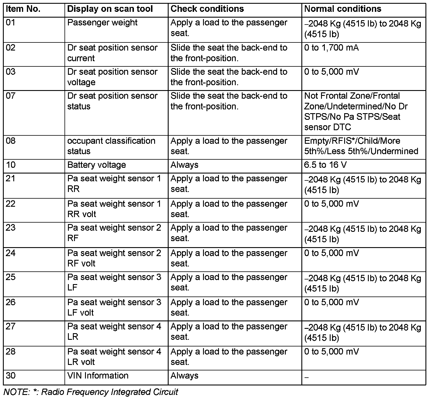 The following items can be read by the scan tool from the occupant classification-ECU input data.