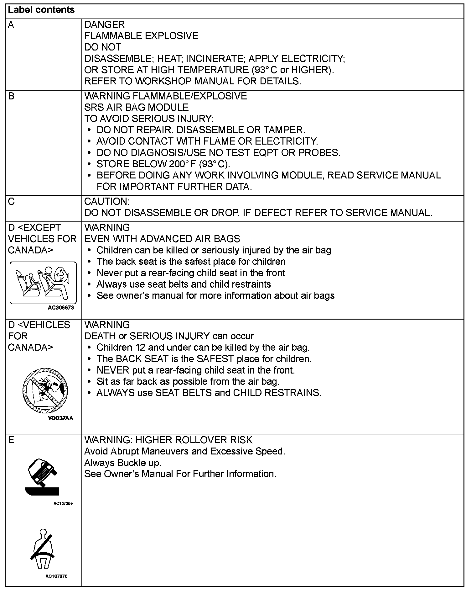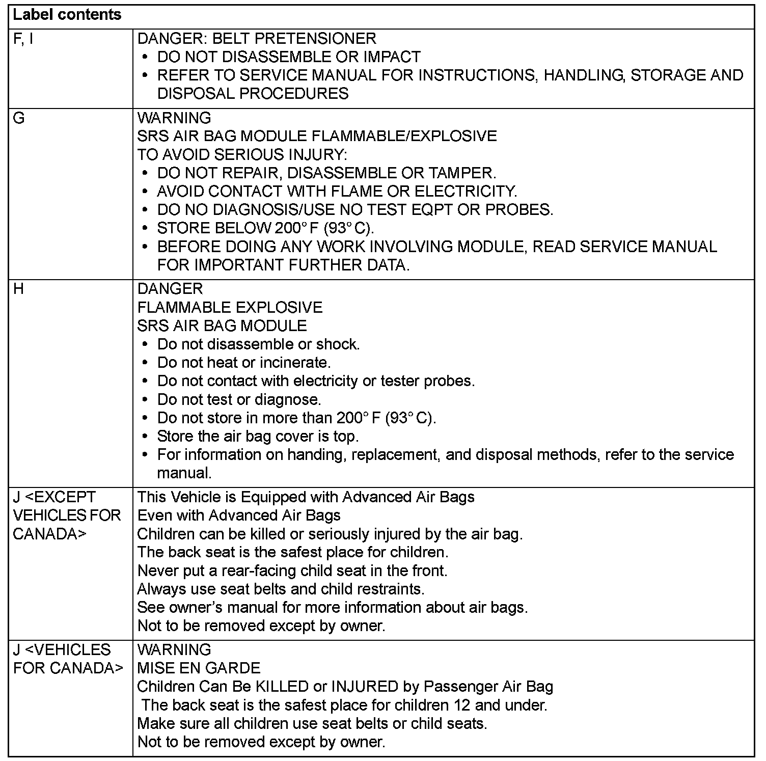 WARNING/CAUTION LABELSA number of caution labels related to the SRS are found in the vehicle, as shown in the following illustrations. Follow label instructions when servicing SRS. The label I is not to be removed except by owner. If the other labels are dirty or damaged, replace them.