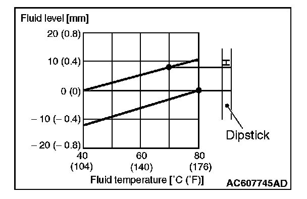 NOTE: If it takes some amount of time until the transmission fluid reaches its normal operating temperature [70 - 80 °C (158 - 176 °F)], check the transmission fluid level by referring to the left diagram.