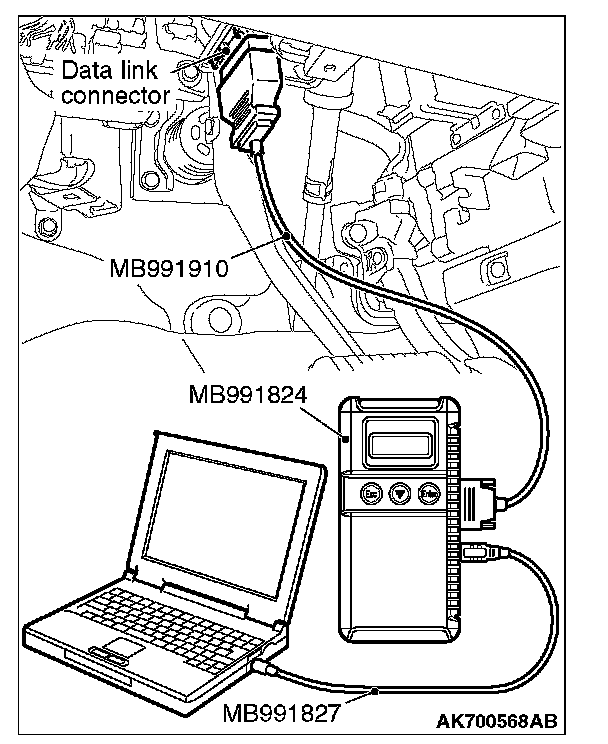 CONFIRMATION METHODCAUTION: To prevent damage to scan tool MB991958, always turn the ignition switch to the "LOCK" (OFF) position before connecting or disconnecting scan tool MB991958.