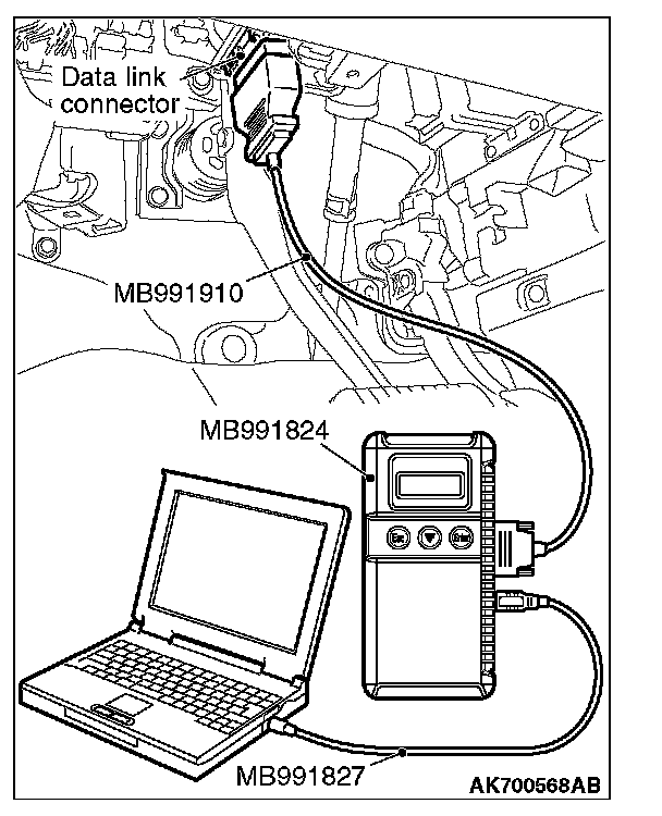 NOTE: Disconnecting the scan tool MB991958 is the reverse of the connecting sequence, making sure that the ignition switch is at the "LOCK" (OFF) position.
