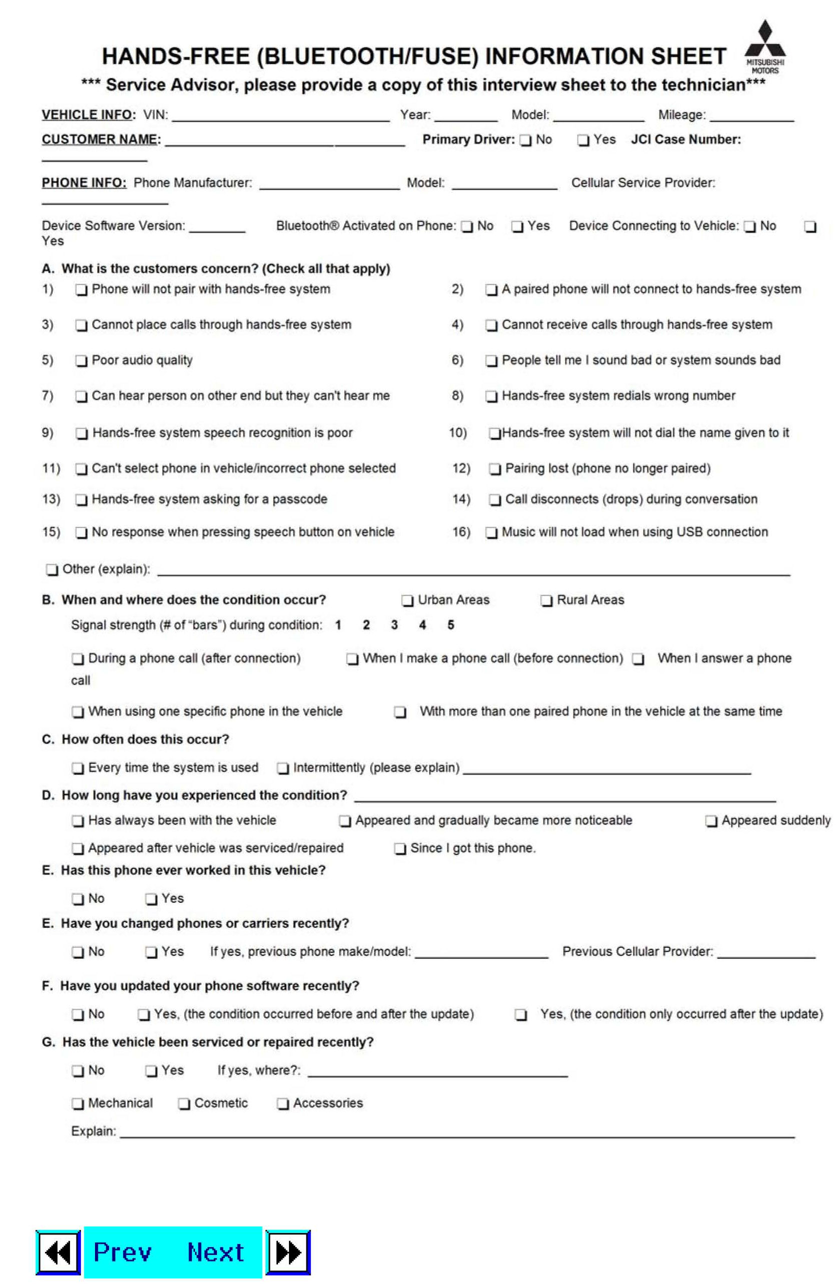 2. Complete the Hands-free (Bluetooth/Fuse) Information Sheet later in this TSB. Make sure you clearly understand the customer's description and comments before proceeding.