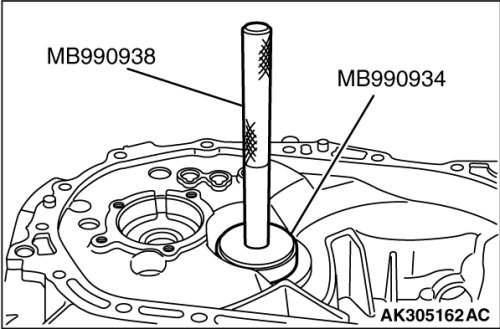 2. Using special tools MB990938 and MB990934, press fit the outer race into the clutch housing.