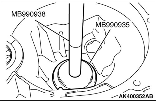 2. Using special tools MB990938 and MB990935, press fit the outer race into the clutch housing.