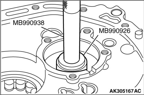 2. Using special tools MB990938 and MB990926, press fit the oil seal into the clutch housing.