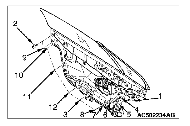 CAUTION: When loosening the door window glass mounting bolts, use a magnetic wrench to prevent bolts from dropping into the door window module assembly cavity.