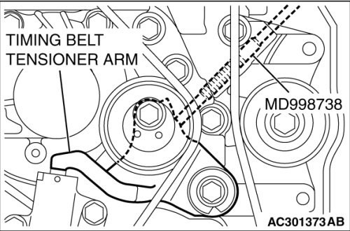 3. Screw in special tool MD998738 by hand until it contacts the timing belt tensioner arm.