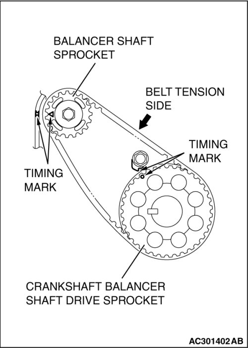 2. Install the balancer timing belt on the crankshaft balancer shaft drive sprocket and balancer shaft sprocket. There should be no slack on the tension side.