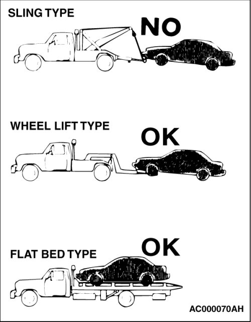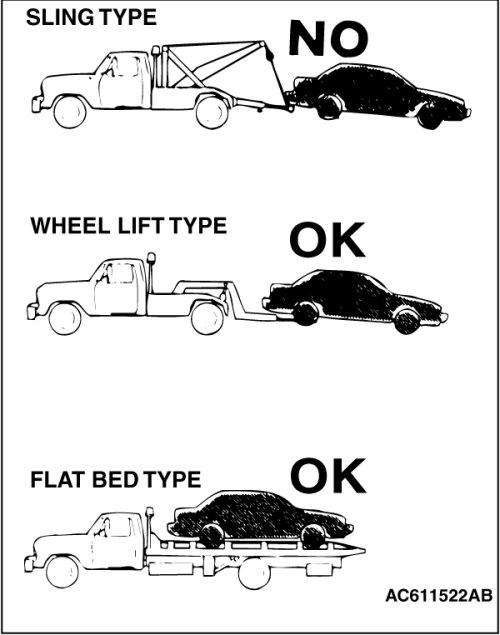 This vehicle cannot be towed by a wrecker using sling-type equipment; otherwise the bumper may become deformed. If this vehicle is towed, use wheel lift or flat bed equipment.