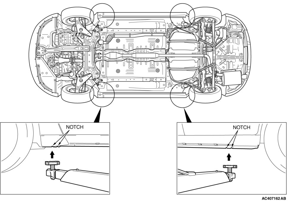 Special care should be taken when raising the vehicle on a frame contact type hoist. The hoist must be equipped with the proper adapters in order to support the vehicle at the proper locations.