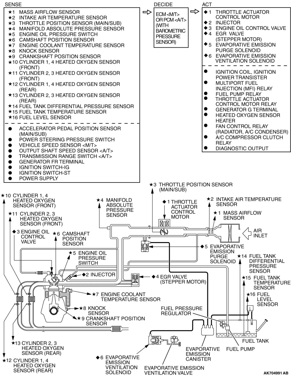 The Multiport Fuel Injection System consists of sensors, actuators and the engine control module (ECM) [M/T] or the powertrain control module (PCM) [A/T].