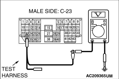 (1)Disconnect intermediate connector C-24 and TCL/ASC-ECU connector A-38, and measure the voltage at the male side of intermediate connector C-24 (at front wiring harness side).