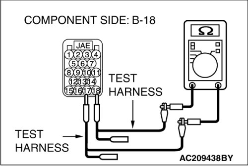 (2)Measure the resistance between ECM [M/T] or PCM [A/T] connector B-18 (terminals 17 and 18).