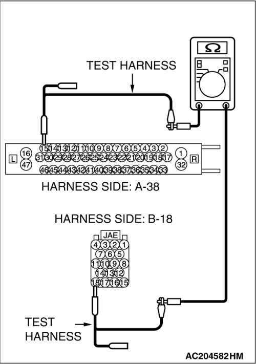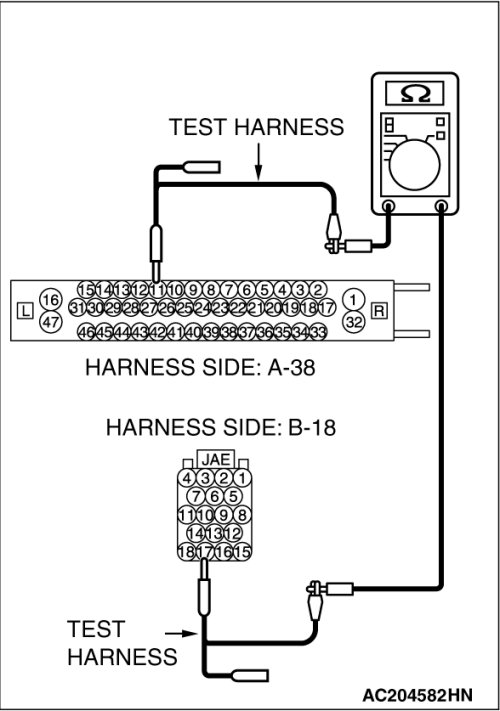 (1)Disconnect TCL/ASC-ECU connector A-38 and ECM [M/T] or PCM connector [A/T] B-18, and measure the resistance between each wiring harness side connector.