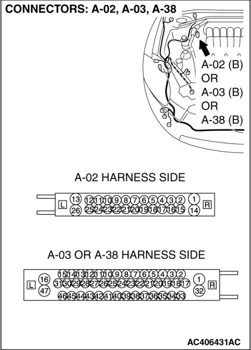 STEP 1. Check TCL/ASC-ECU connector A-38 and ECM connector [M/T] or PCM connector [A/T] B-18 for loose, corroded or damaged terminals, or terminals pushed back in the connector.