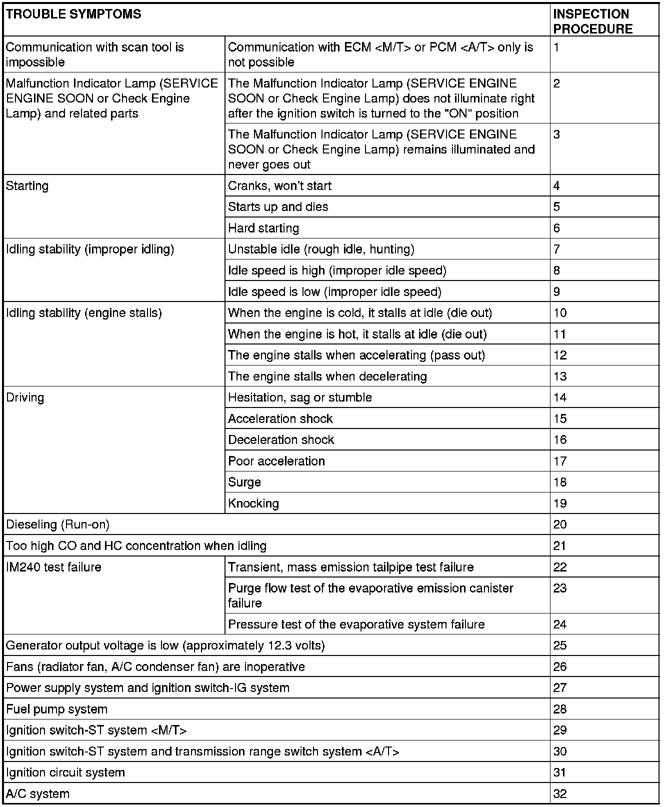 Check that the ECM [M/T] or the PCM [A/T] ground circuit is normal before checking for the cause of the problem.