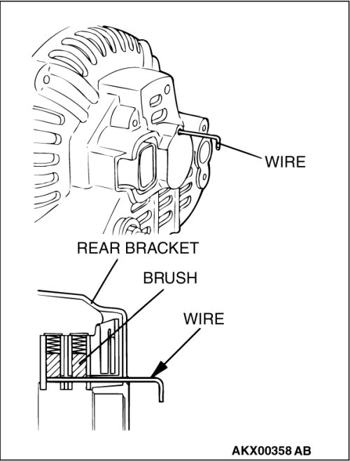 After installing the regulator assembly, insert a wire through the hole provided on the rear bracket while pressing down on the brush, and secure the brush.