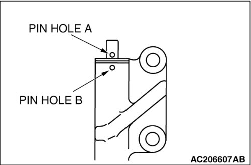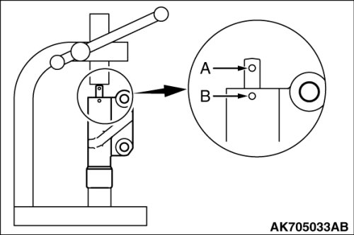Slowly compress the pushrod of the auto-tensioner until pin hole A in the pushrod is aligned with pin hole B in the cylinder.