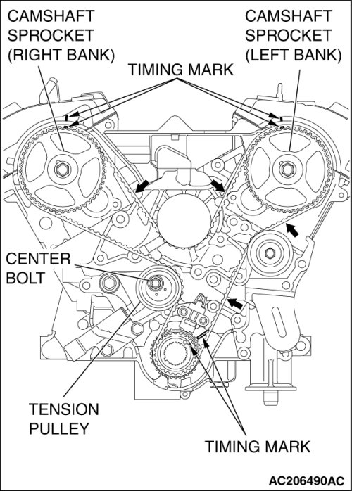 3. Turn the camshaft sprocket (Right bank) counterclockwise until the tension side of the timing belt is firmly stretched. Check all the timing marks again.