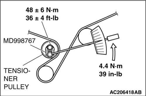Loosen the center bolt of the tensioner pulley. Use special tool MD998767 and a torque wrench to apply the tension torque to the timing belt as shown in the illustration. Then tighten the center bolt to the specified torque.