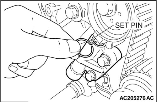 Insert the set pin into the set holes. This auto-tensioner setting pin will be used during timing belt alignment.