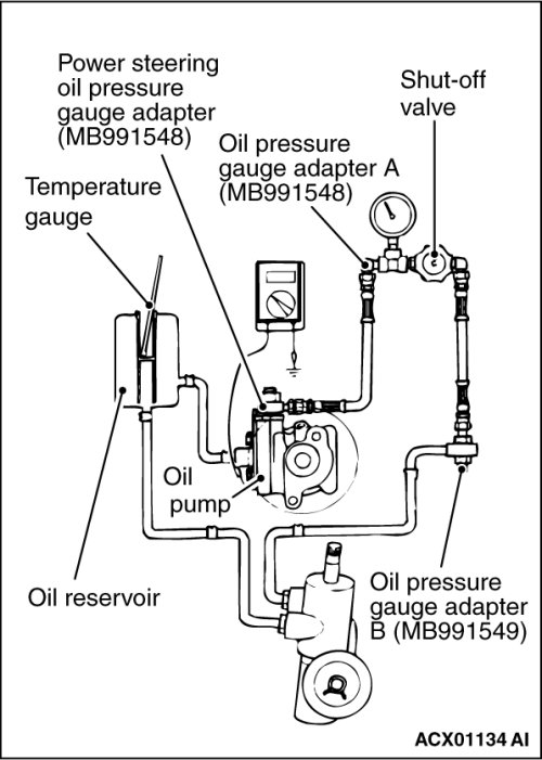 1. Disconnect the pressure hose from the oil pump, and then connect the special tools MB991548, MB990662 and MB991549.