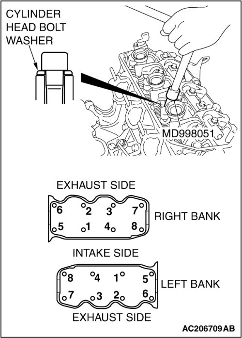 Using special tool MD998051 and a torque wrench, tighten the bolts to the specified torque in the order shown in the illustration. (in two or three cycles)