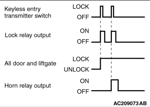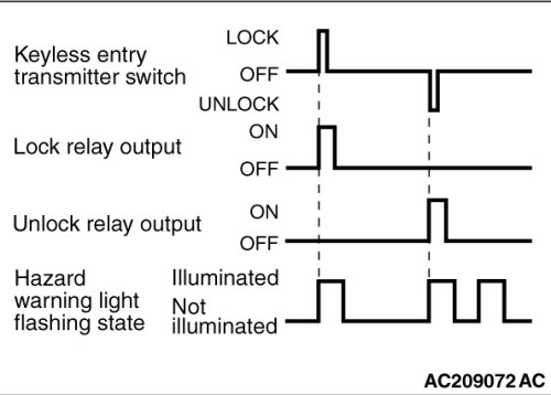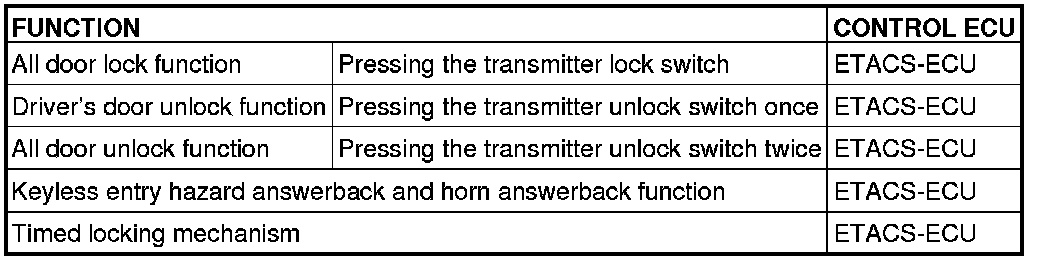 If the keyless entry transmitter is used to send a driver's door lock signal to the ETACS-ECU, the tone alarm sounds when the ETACS-ECU receives the lock signal.