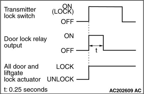 When the transmitter lock switch is pressed, the ETACS-ECU energizes its door lock relay to operate all the door lock actuators for 0.25 second, locking all doors.