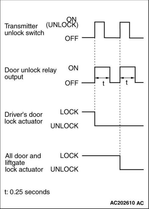 When the transmitter unlock switch is pressed twice, the ETACS-ECU energizes its door unlock relay to operate the driver's door lock actuator and the other door lock actuators for 0.25 seconds each in succession. All the doors will be unlocked.