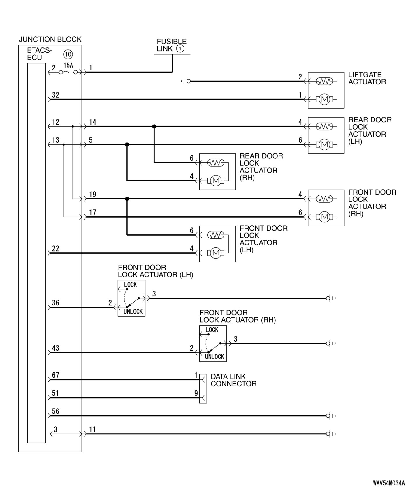 When the transmitter unlock switch is pressed once, the ETACS-ECU energizes its door unlock relay to operate the door lock actuator of the driver's door for 0.25 seconds, thus unlocking only the driver's door.