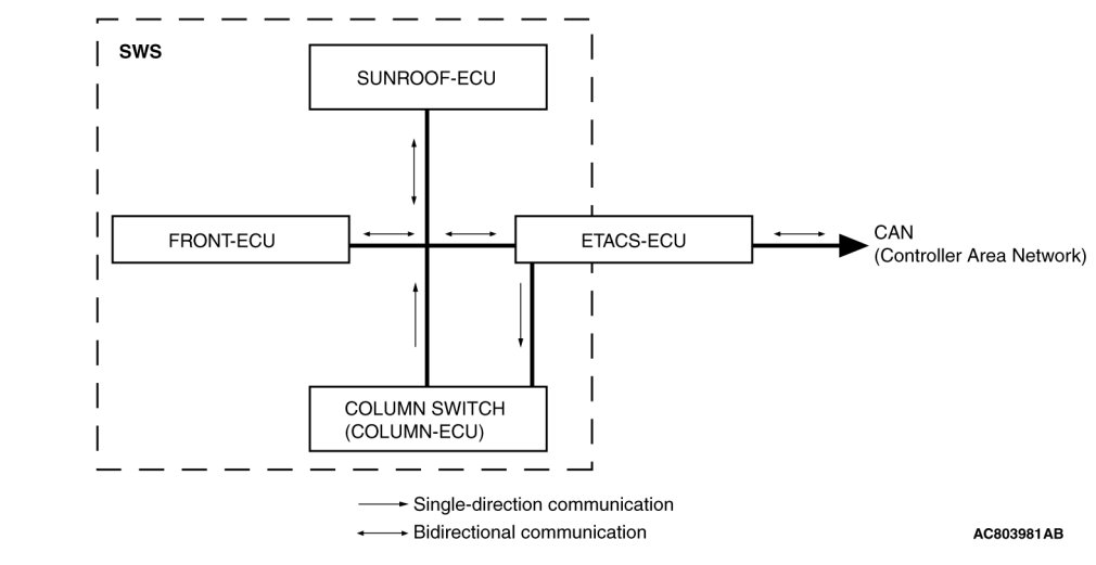 As shown in the figure, SWS communications connect the ETACS*1-ECU, the column switch (column-ECU is built in), the front-ECU, and the sunroof-ECU.