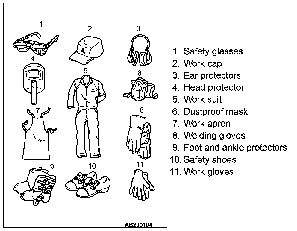 During body repair work, a work suit, a work cap, and safety shoes should be worn at all times. Depending on the work being done, safety glasses, gloves, ear protectors, a dustproof mask, etc., should also be worn as needed.