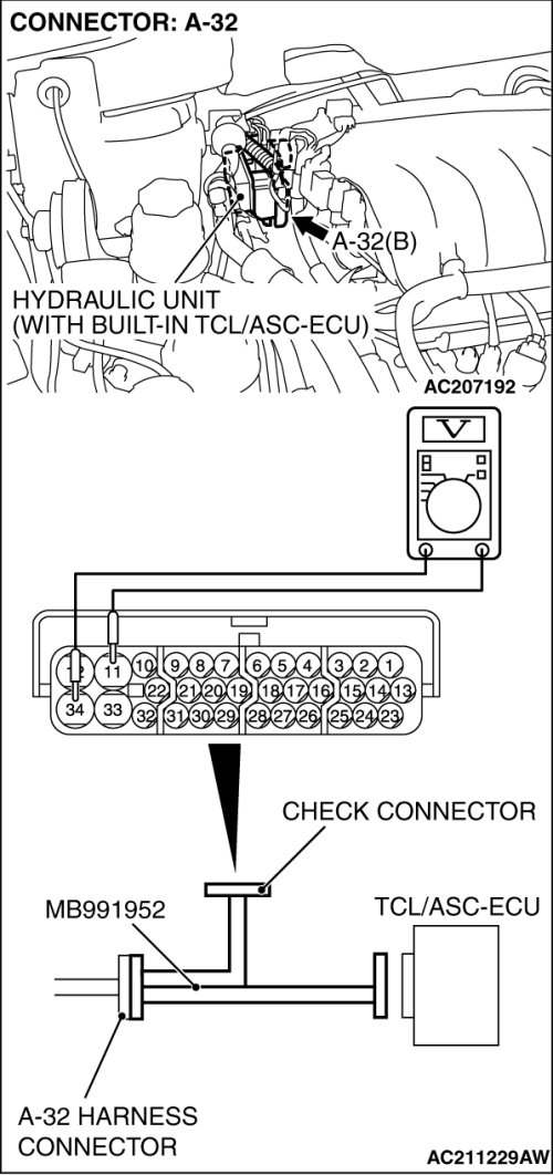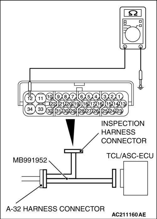 1. Disconnect the TCL/ASC-ECU connector A-32, and then use the special tool ABS Check Harness