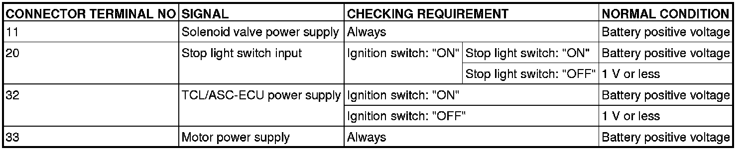 Do not measure terminal voltage for approximately three seconds after the ignition switch is turned "ON." The TCL/ASC-ECU performs the initial check during that period.