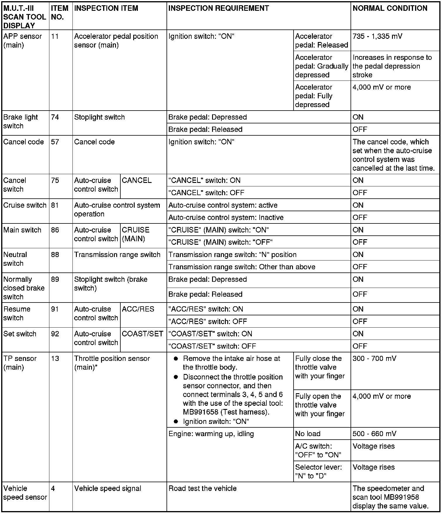 *:After the inspection is completed, disconnect the throttle position sensor connector, and then delete the diagnostic trouble code using use of scan tool MB991958. (Refer to Reading and Clearing Diagnostic Trouble Codes).