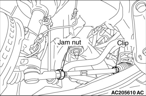 1. Adjust the toe-in by undoing the clip and jam nut, and turning the left and right tie rod turnbuckles by the same amount (in opposite directions).