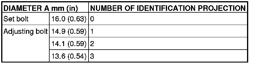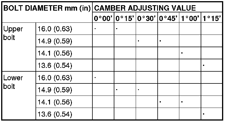 1. Estimate how much additional camber adjustment is required. Using the table below, select the camber adjusting bolt, and then replace the knuckle and strut assembly connection bolts (upper bolt, lower bolt) with the selected bolts.