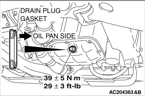 4. Install a new drain plug gasket so that it faces in the direction shown in the illustration, and then tighten the drain plug to the specified torque.