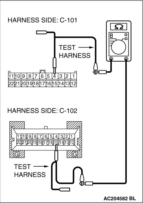 STEP 5. Check joint connector (4) C-101 and combination meter connector C-102 for loose, corroded or damaged terminals, or terminals pushed back in the connector.
