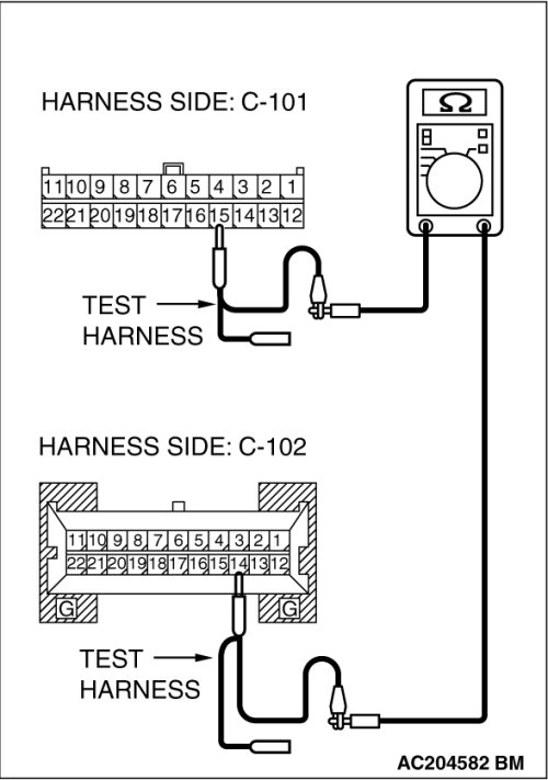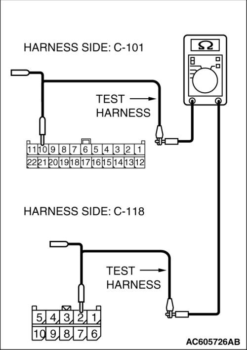 (1)Disconnect joint connector (4) C-101 and combination meter connector C-102, and measure the resistance between each wiring harness side connector.