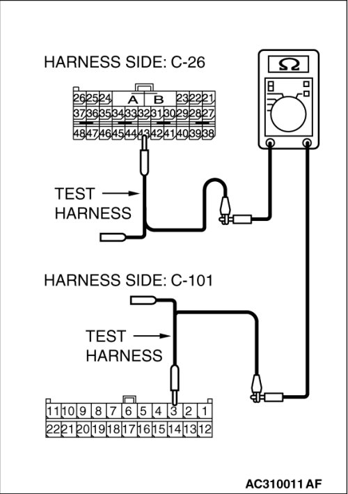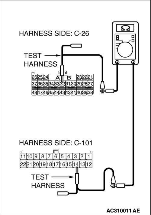 (1)Disconnect joint connector (4) C-101 and SRS-ECU connector C-26, and measure the resistances at the wiring harness sides of joint connector (4) C-101 and SRS-ECU connector C-26.