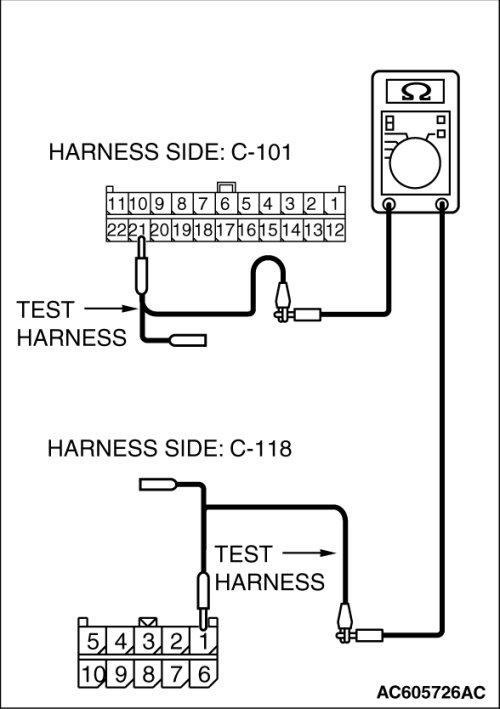 (1)Disconnect joint connector (4) C-101 and TPMS receiver connector C-118, and measure the resistances at the wiring harness sides of joint connector (4) C-101 and TPMS receiver connector C-118.