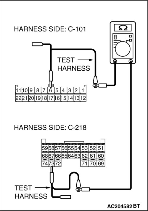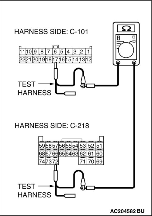 (1)Disconnect joint connector (4) C-101 and ETACS-ECU connector C-218, and measure the resistances at the wiring harness sides of joint connector (4) C-101 and ETACS-ECU connector C-218.