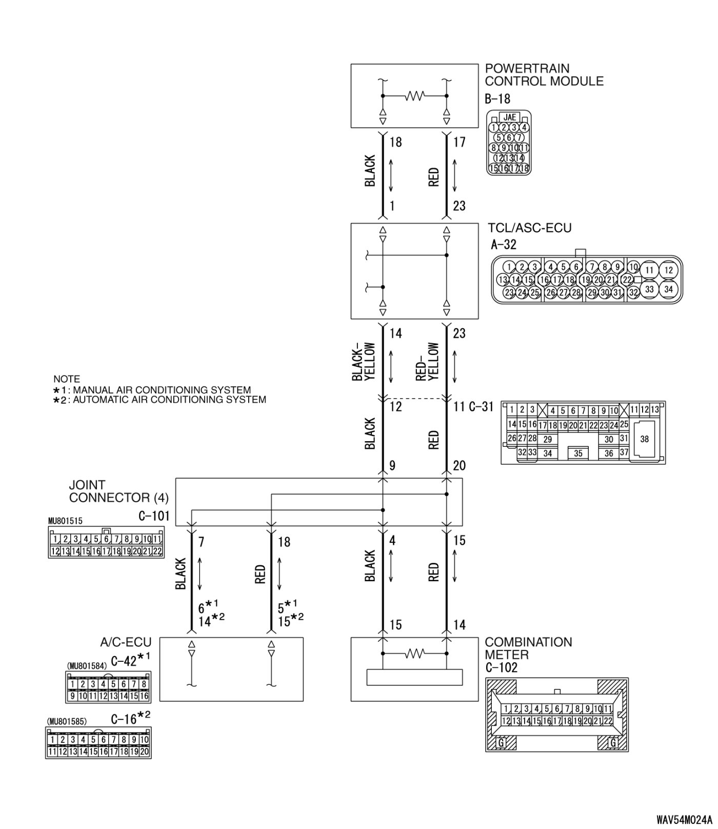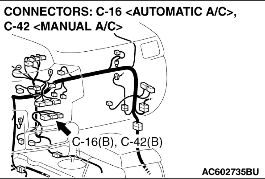 STEP 1. Check joint connector (4) C-101 and A/C-ECU connector C-42 [manual air conditioning system] or A/C-ECU connector C-16 [automatic air conditioning system] for loose, corroded or damaged terminals, or terminals pushed back in the connector.