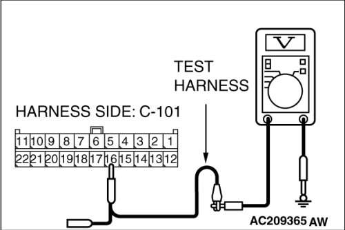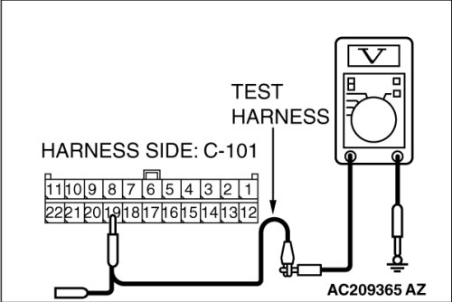 (1)Disconnect joint connector (4) C-101 and multi-center display unit (middle-grade type or Mitsubishi Multi Communication System) connector C-06 [multi-center display unit (middle-grade type)] or C-128 [multi-center display unit (Mitsubishi Multi Communication System)], and measure the voltage at the wiring harness side of joint connector (4) C-101.