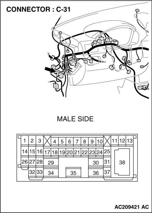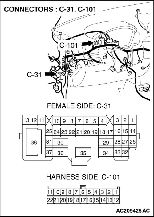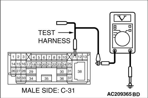 (1)Disconnect intermediate connector C-31 and TCL/ASC-ECU connector A-32, and measure the voltage at the male side of intermediate connector C-31 (at front wiring harness side).