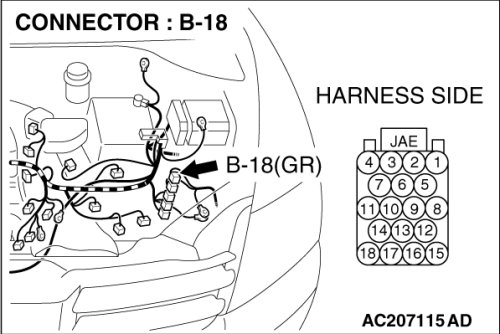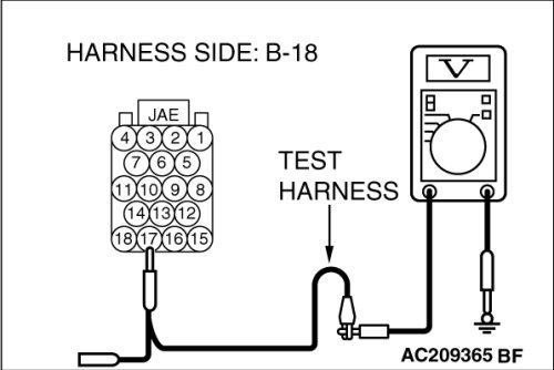 (1)Disconnect powertrain control module connector B-18 and TCL/ASC-ECU connector A-32, and measure the voltage at the harness side of powertrain control module connector B-18.
