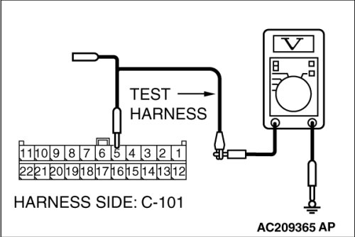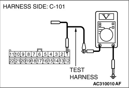 (1)Disconnect joint connector (4) C-101 and multi-center display unit (middle-grade type or Mitsubishi Multi Communication System) connector C-06 [multi-center display unit (middle-grade type)] or C-128 [multi-center display unit (Mitsubishi Multi Communication System)], and measure the voltage at the wiring harness side of joint connector (4) C-101.