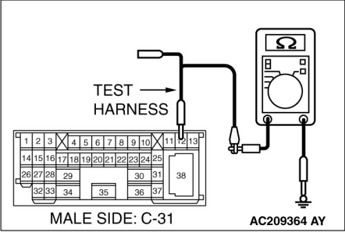 (1)Disconnect intermediate connector C-31 and TCL/ASC-ECU connector A-32, and measure the resistance at the male side of intermediate connector C-31 (at front wiring harness side).